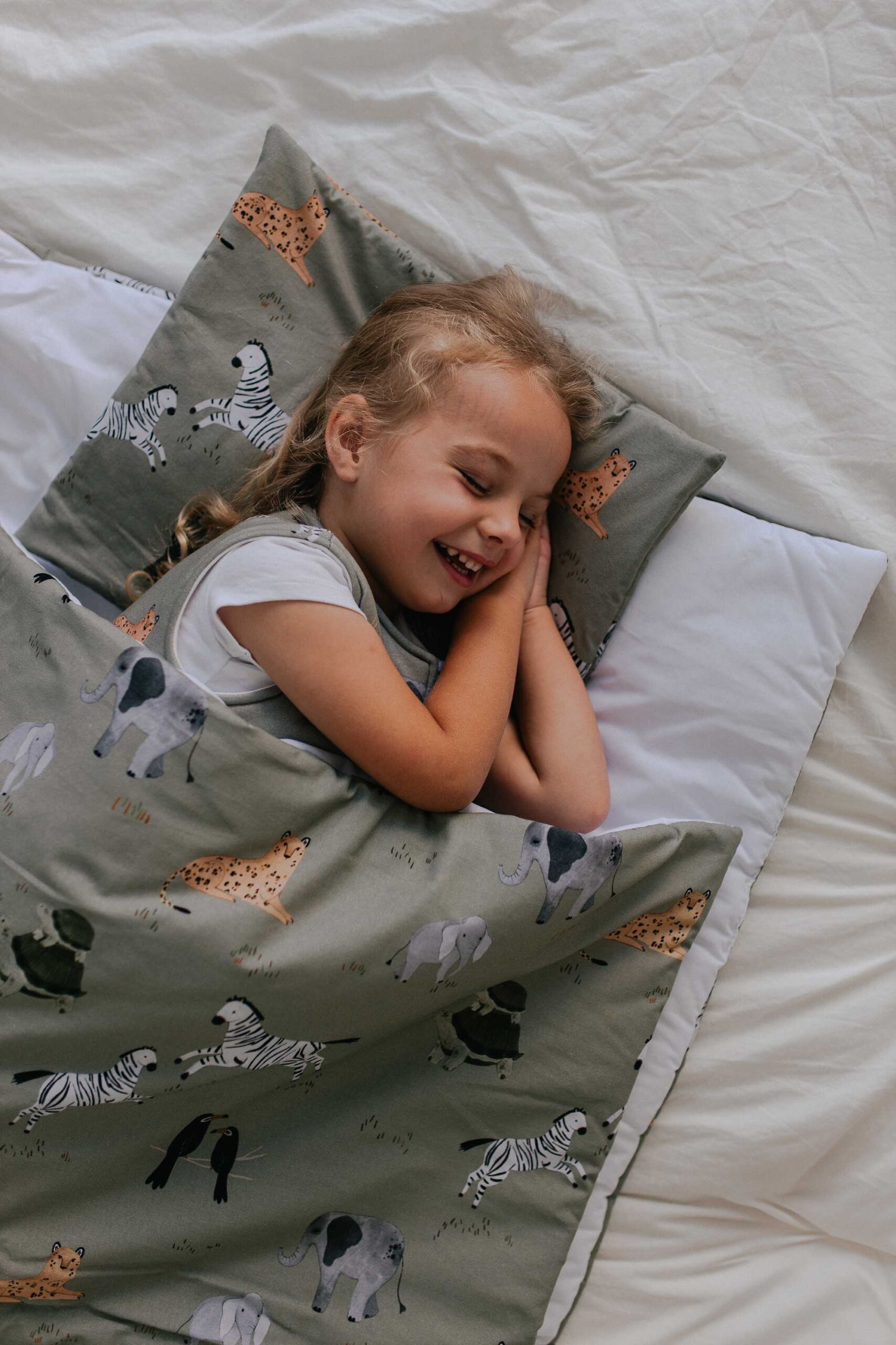 Nasza pościel przedszkolaka jest jednocześnie kołderką i prześcieradłem, dzięki czemu szybko i sprawnie można ją rozłożyć do spania na drzemkę w żłobku czy przedszkolu. W zestawie z płaską poduszką idealną dla małych dzieci. Dzięki specjalnej taśmie doszytej do kołderki, można ją z łatwością złożyć, schować czy przenieść. Sprawdź jak złożyć pościel. To sprawia, że nie wymaga dodatkowych worków! Cała pościel przedszkolaka składa się tylko z dwóch elementów, dzięki czemu jest bardzo wygodna w codziennym użytkowaniu. Dostępna w czterech zwierzęcych wzorach, które pokocha każdy Maluch!