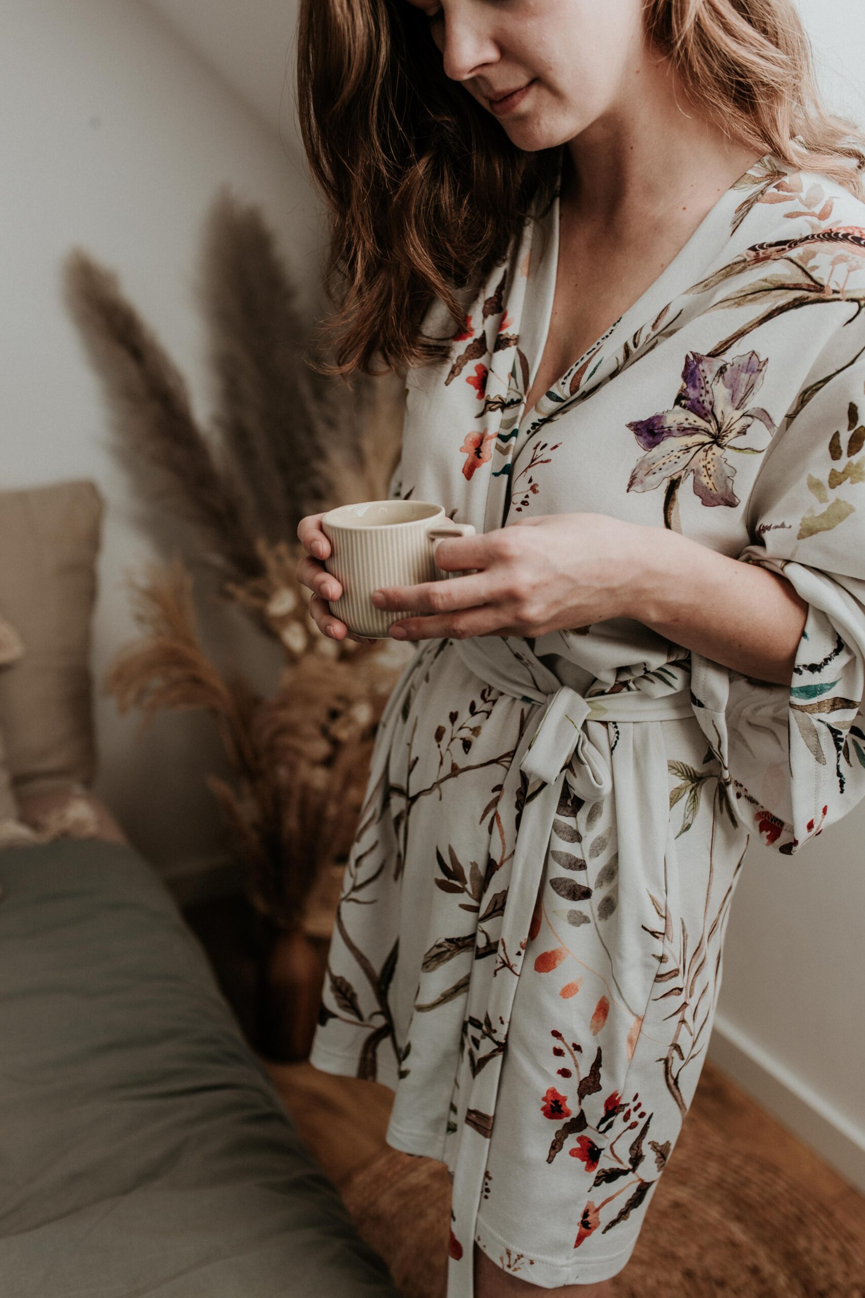Niezwykle kobiecy i unikatowy szlafrok damski, który pokochasz od pierwszego założenia. Idealny na czas ciąży i po porodzie. Uniwersalny krój kimono dopasuje się do każdej figury.